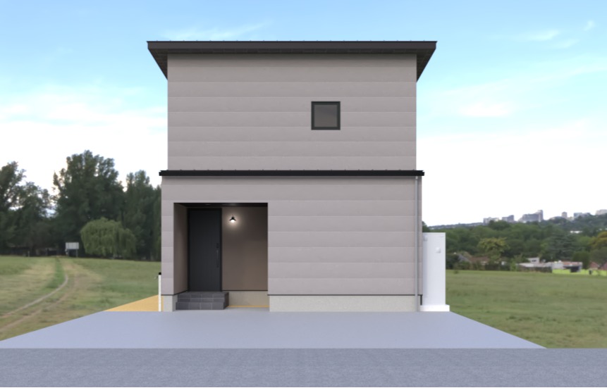金属系の外壁材をメインに、アクセントとして、玄関まわりは和の伝統色の吹き付け材を施工。 モダンな中にも、落ち着きのある外観になりました。