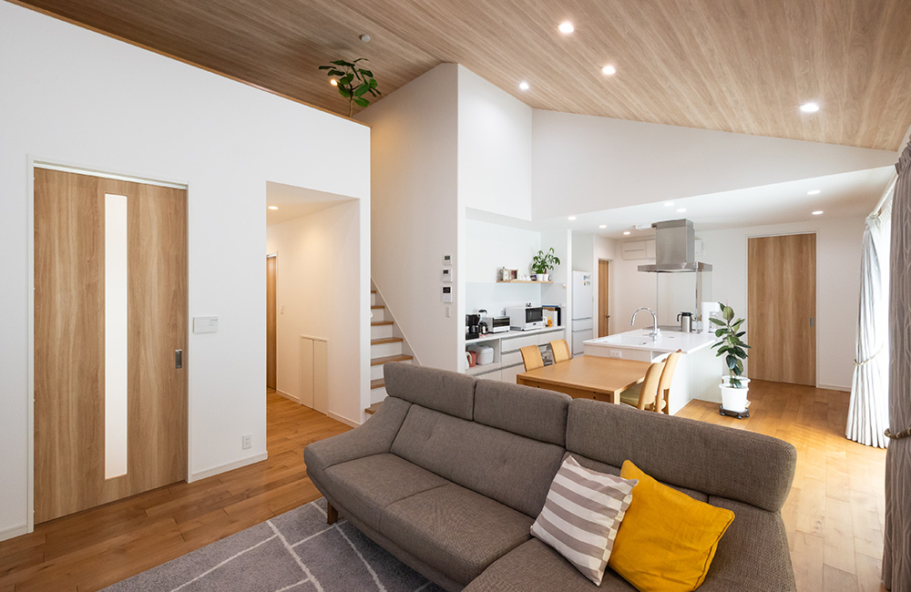 勾配天井を採用し、広々とした開放感が魅力のLDK。白い壁とメープルの無垢材の床、そして木目を生かした天井が調和し、ナチュラルで優しい雰囲気を演出。以前のお住まいは昔ながらの間取りで、南面の良い場所に客間、ダイニングキッチンは北側、玄関もゲスト用として利用されていました。今回の建て替えでは、風通しが良く、陽当たりの良い場所にLDKを配置することで、より快適な暮らしが実現しました。