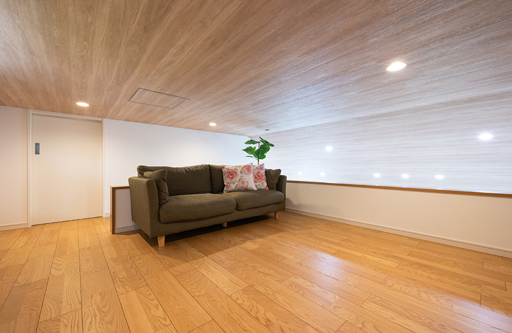 固定階段で上り下りできるロフトには、扉付きの大容量収納スペースを設け、収納スペースの確保が難しいとされる平屋の課題を見事に解決しました。「これがあるのとないのでは、全然違いますね!」と奥さまも大変喜ばれています。収納としてはもちろんですが、セカンドリビングとしても活用できるのが魅力。