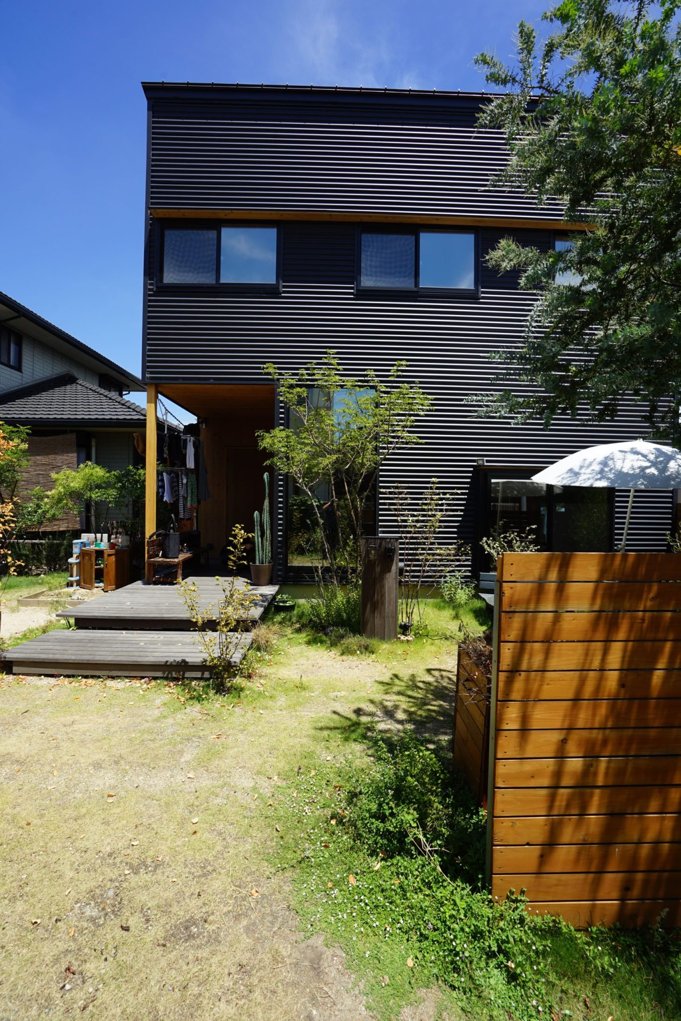 広い木製のデッキが特徴的な「戸田の家」。リビングダイニングから大きな開口部で芝生のお庭と繋がり一体的に使えるよう設計しています。