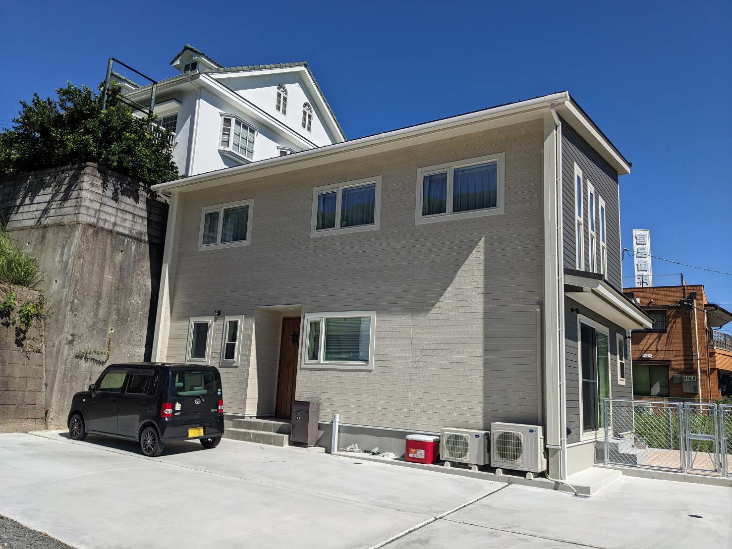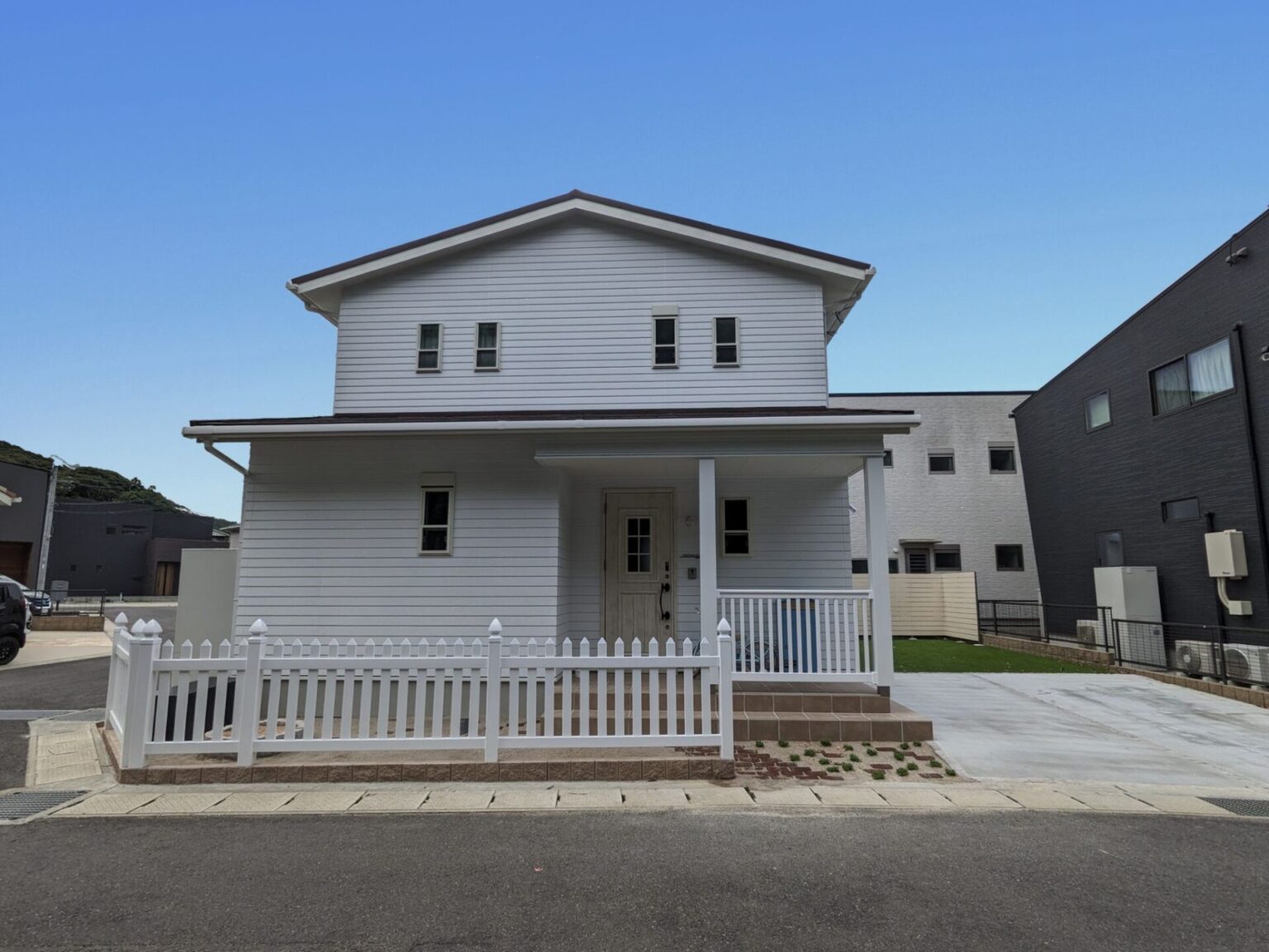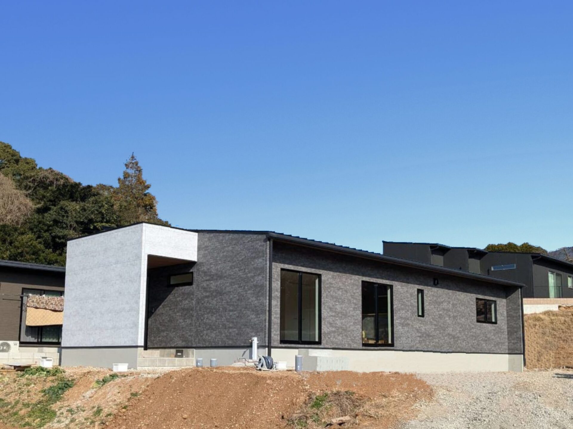 石目調の模様が目をひくグレーにホワイトをアクセントにしたモダンな外観。外壁材はケイミューのフィエルテを使用しています。カラーはチタンアイロン、アクセントがチタンコンクリートです。フィエルテは当社でも採用率の高い人気の外壁材です。お洒落な外観にしたい、モダンな外観にしたいというという方にオススメの外壁材になります。