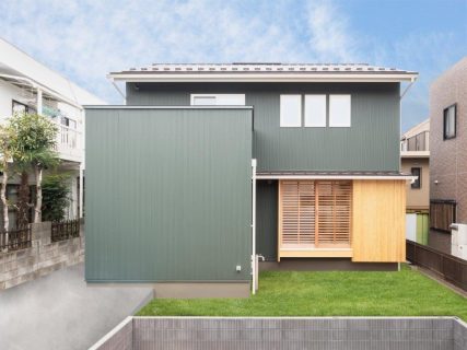 モスグリーンの外壁と栂の網戸の組み合わせが良いです。