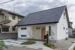 すっきりとした総二階建ての切妻屋根を基本としていますが、玄関と勝手口の屋根庇にも天然石の屋根を用い、メンテナンスなしで長持ちする無添加住宅となっています。