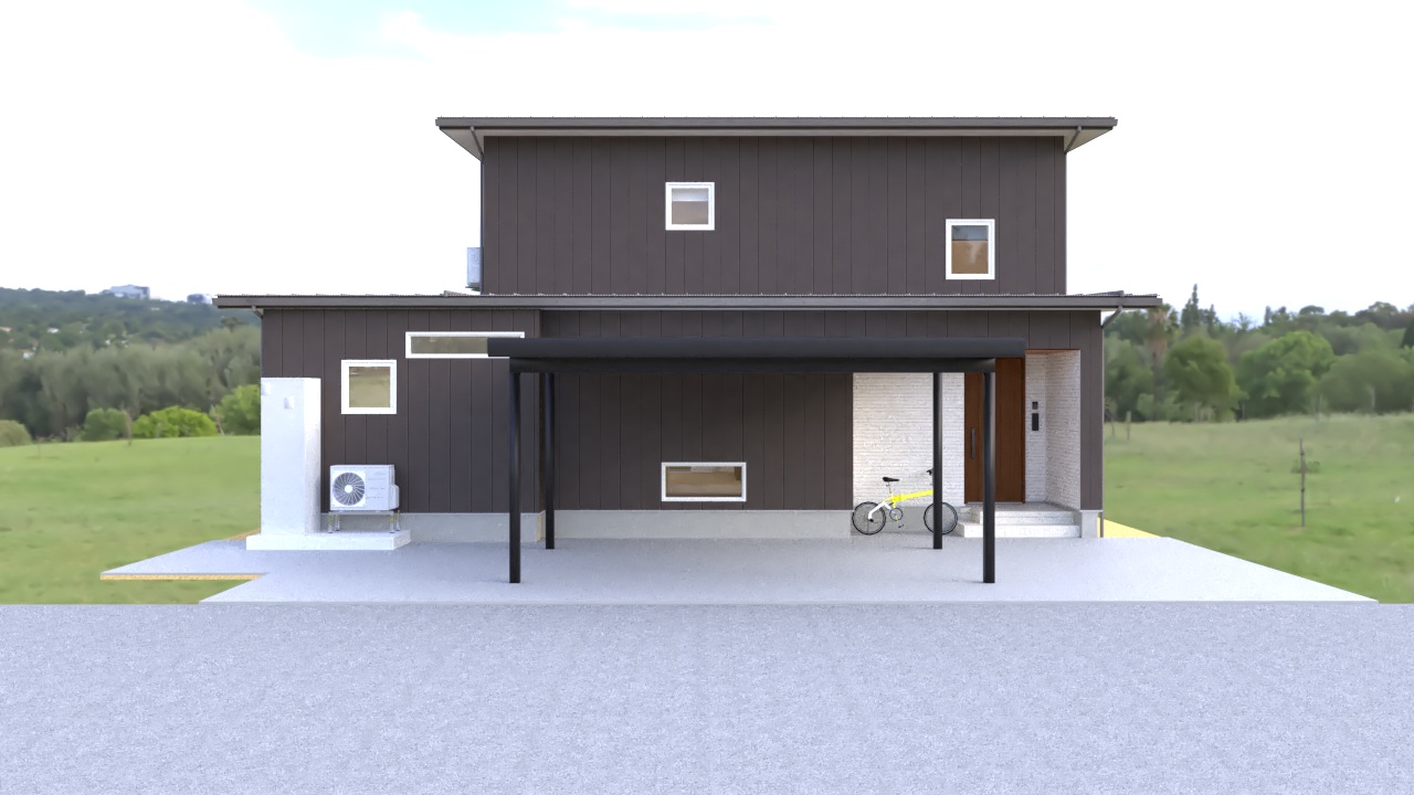 玄関横には、自転車を雨にさらさず置けるスペースを設け、日々の使いやすさにも配慮。