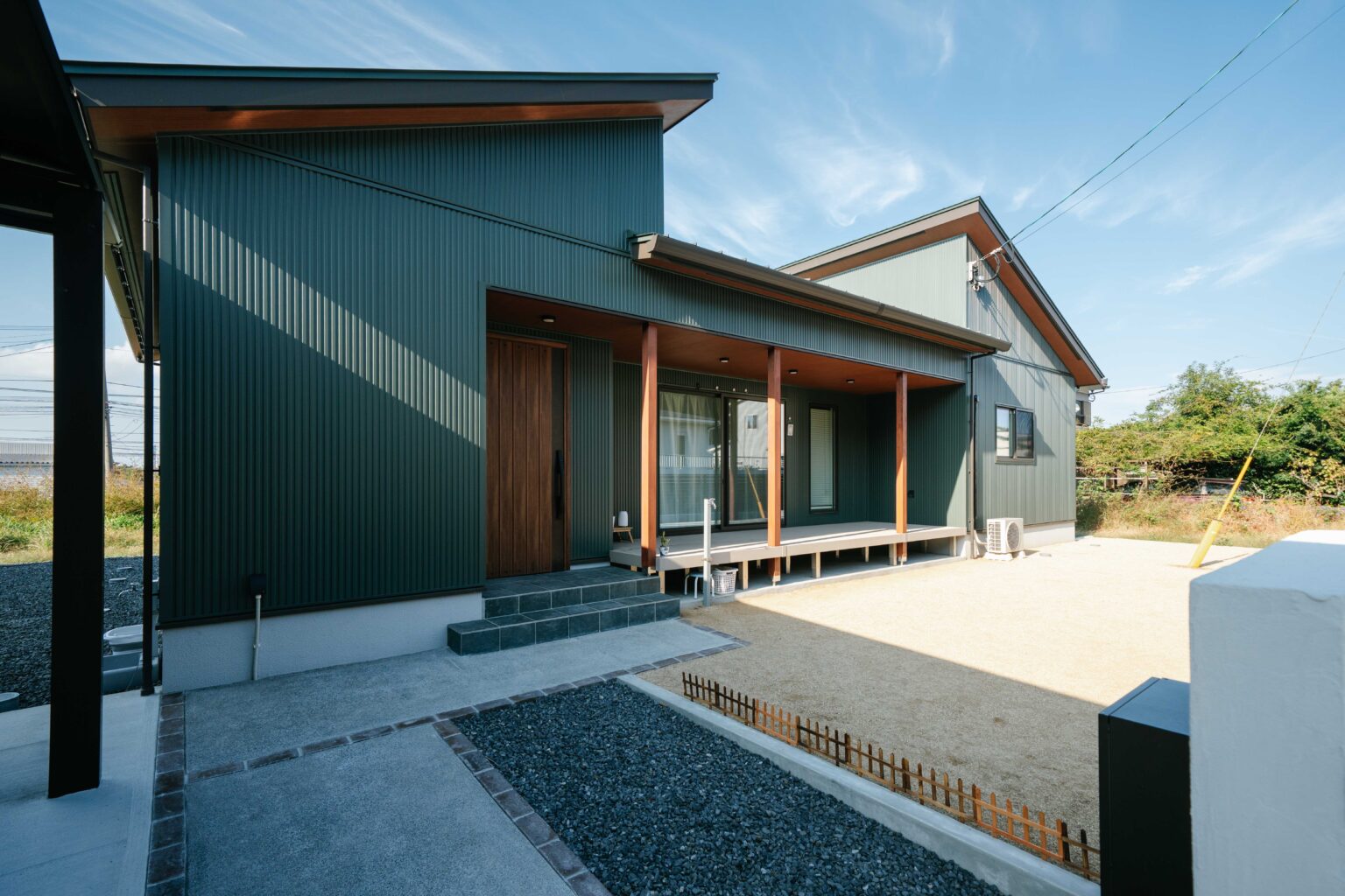 存在感があるモスグリンの外壁がセンスあふれる平屋建て。