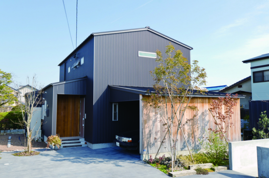 意匠性と機能性を併せ持つシックな外観。植栽の足元には桜島の溶岩石を取り寄せました。