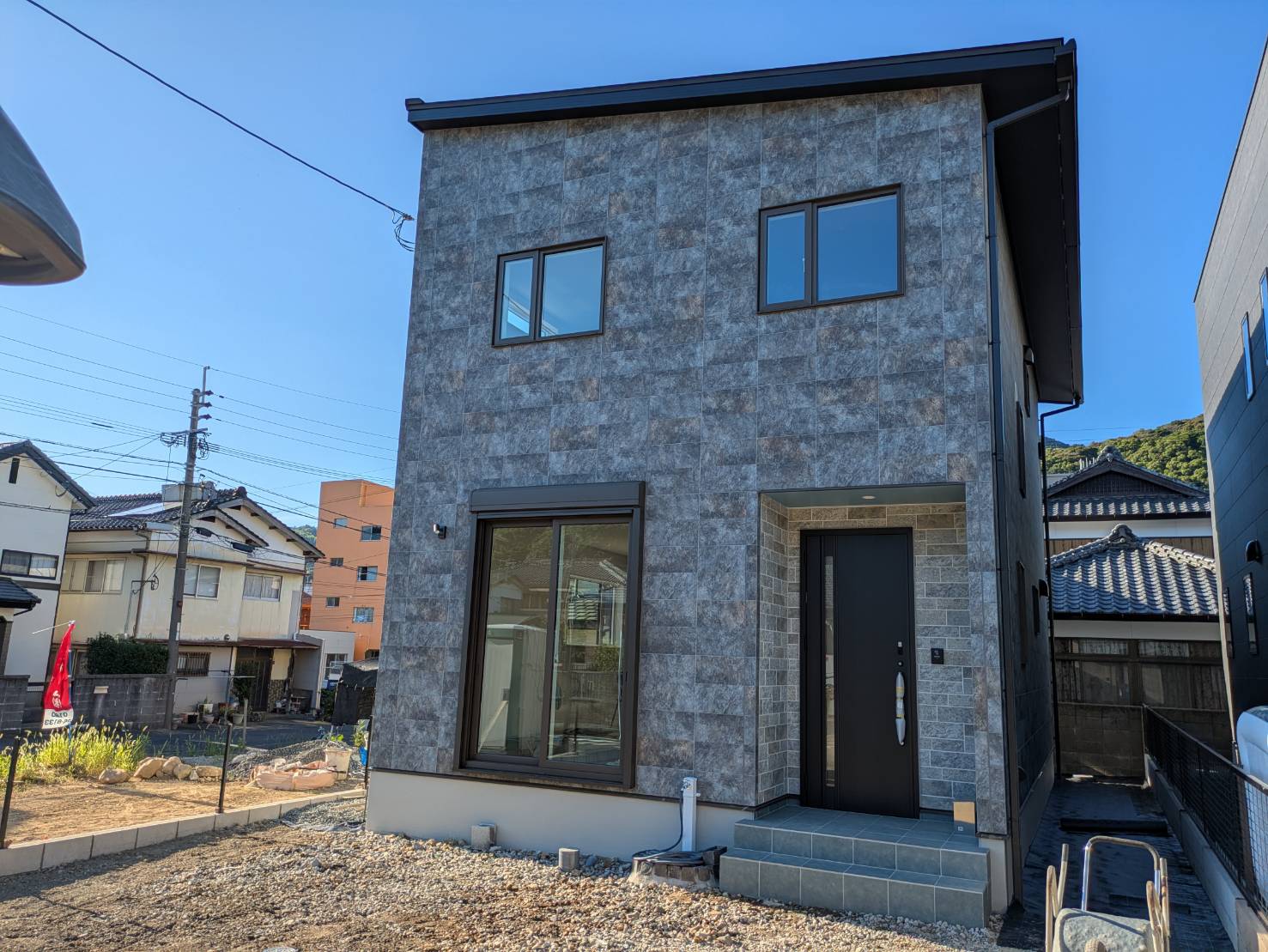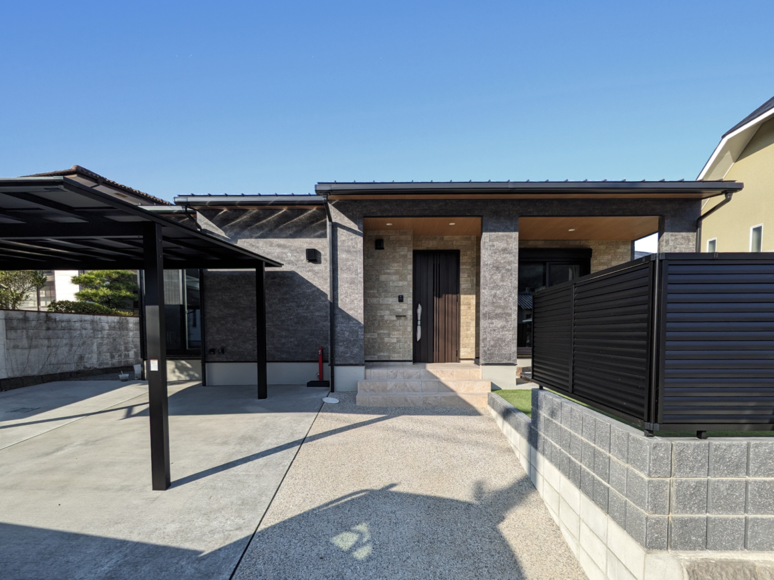 石目調の外壁が高級感を感じる外観。メインはケイミューのフィエルテ・チタンアイロン、玄関回りはニチハリヴコロール・リヴイエローです。