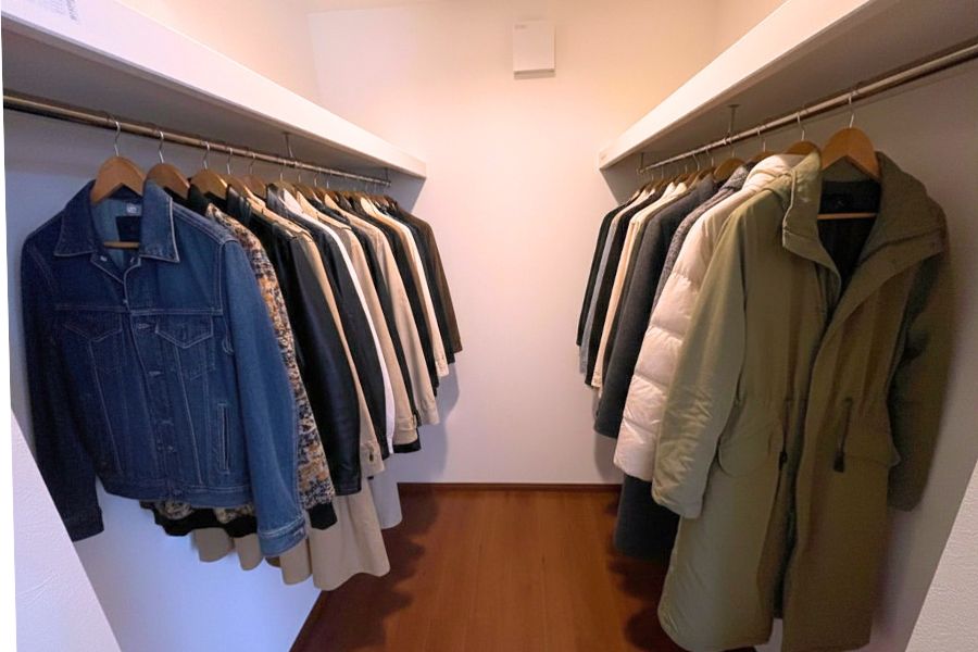 両サイドにたっぷりとハンガーパイプを設けた、機能的でゆとりあるウォークインクローゼット。ダークトーンの床と清潔感のある白い壁が、お気に入りの洋服たちを引き立てる「見せる収納」を叶えます。デニムジャケットやトレンドのロングコートが整然と並ぶ様子は、まるでプライベートショップのよう。身支度さえも心踊る特別な時間に変える、整理整頓の美しさと使いやすさを追求した空間です。