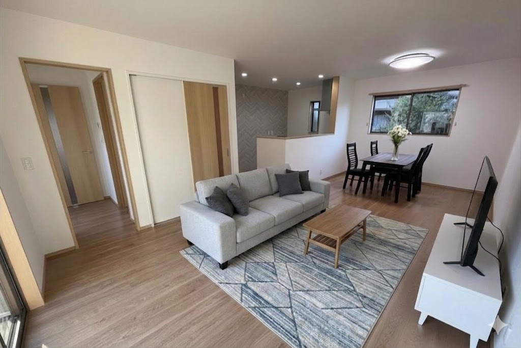 温もりを感じる木目調のフローリングと、上質なライトグレーのインテリアが調和した心地よいLDK。リビング、ダイニング、キッチンが一直線に配置された開放的なレイアウトは、どこにいても家族の気配を感じられる安心感を生み出します。テレビ正面にゆったりと構えたソファが、日々の疲れを癒やす贅沢な団らんのひとときを演出。光が差し込む大きな窓と、アクセントクロスが彩るキッチンカウンターが、日常を格上げする洗練された暮らしを叶えます。