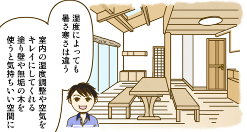 …実は湿度によって暑さ寒さの感じ方は違ってきます。特に夏は湿度が上がることでいわゆる「蒸し暑い」という状況を作らないことが大切です。逆に冬場は湿度が下がりすぎることで体の表面からの気化が促進され肌寒く感じます。乾燥するとのどにもお肌にもよくないですよね。ではどうするか?よく知られているところでは、しっくいや珪藻土などの塗り壁を使用したり、ムクの木板を壁に貼ることで部屋内の湿度ちょうどよい50%~60%くらいに長背打つすることが可能です。