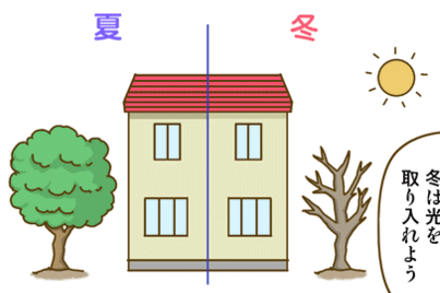 …まず、その土地にどう日が当たるのか・風はどのように通るのかを知っておきましょう。日のあたらないところに大きな窓を配置しても明るくなりにくいですし、冬に風の当たるところに窓を配置したら寒くなります。逆に日のあたるところに大きな窓を配置すれば明るく暖かい部屋になりますし、夏に風の通る方向に窓を配置すれば涼しくなりやすいですよね。庭に広葉樹を植えることで、夏の日差しを防ぎ、葉の落ちた冬には日当たりを確保できる場合もあります。