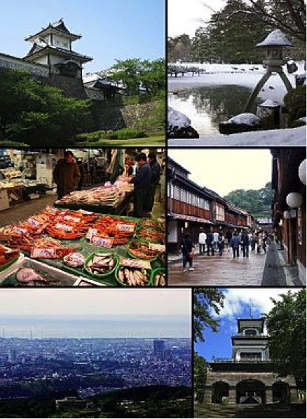 金沢市(かなざわし)は、石川県のほぼ中央に位置する、石川県の県庁所在地です。旧石川郡および河北郡、1996年4月1日、中核市に指定されました。江戸時代には、江戸幕府(約800万石と言われる)を除いて、大名中最大の102万5千石の石高を領した加賀藩(「加賀百万石」)の城下町として栄え、人口規模では江戸・大坂・京の三都に次ぎ、名古屋と並ぶ大都市であった。壊滅した富山市などと異なり、第二次世界大戦中にアメリカ軍からの空襲を受けなかったことから市街地に歴史的風情が今なお残っています。長年の都市文化に裏打ちされた数々の伝統工芸、日本三名園の一つとして知られる兼六園、加賀藩の藩祖・前田利家の金沢入城に因んだ百万石まつり、さらに庶民文化(加賀宝生や郷土料理の治部煮等)などにより、観光都市として知られています。