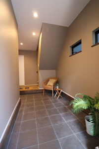 玄関スペースを一般的な住宅よりも広くすることで、これまでただの廊下となっていたスペースに室内でありながら外のような場所を作り、緑を置いて楽しんだり、ベンチや椅子を置いたり趣味の自転車を飾ったりとスペースの楽しみ方が増える住まいになっています。