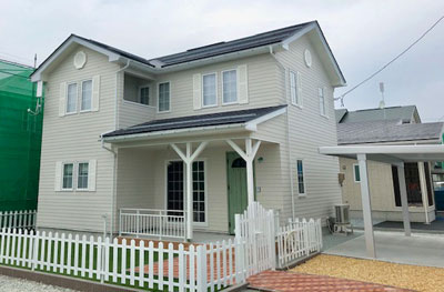 (このお家の家族構成/旦那様と奥様の二人暮らし。いまは奥様のお腹の中には赤ちゃんがおり、暖かいお家ですくすく育ってます。)訪問するお家は、素敵なアメリカンハウスの白い外観です。