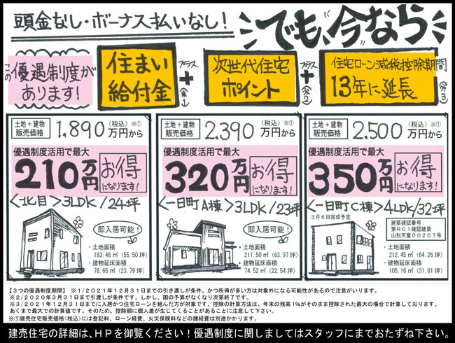 この優遇制度が有ることによって、当社の建売住宅が、210万円から350万円お得になるんです。この機会をお見逃しなく!