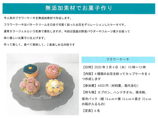 フラワーケーキはバタークリームを口金で可愛く絞ったお花をデコレーションしたケーキです。通常カラージェルという色素で着色しますが、今回は国産の野菜パウダーやフルーツ果汁を使って体に優しいお菓子に仕上げます。