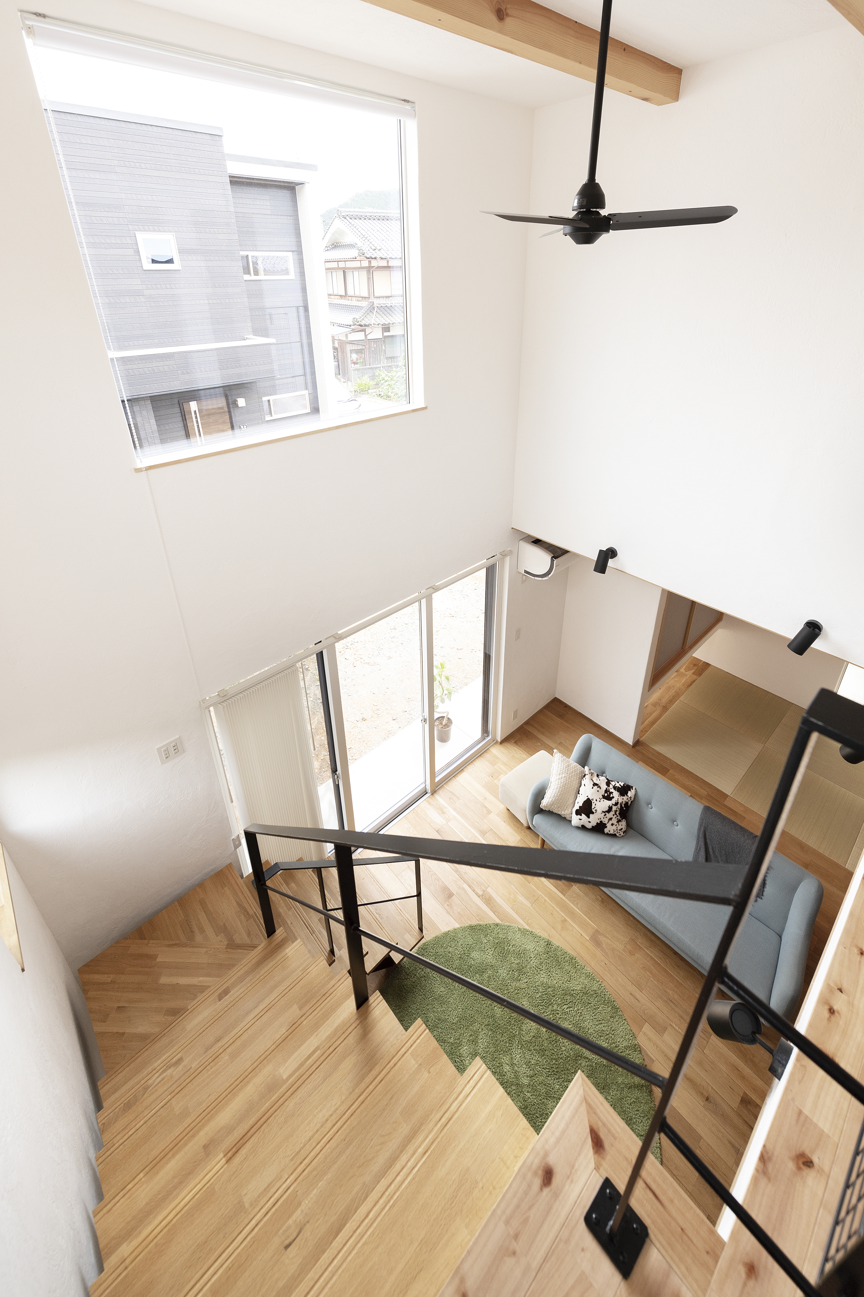 吹抜と鉄骨階段のあるLDKには、大きな窓から自然の光がたっぷり!鉄骨階段の手すりが奥まで開け、お家を広く演出する工夫もされています^^