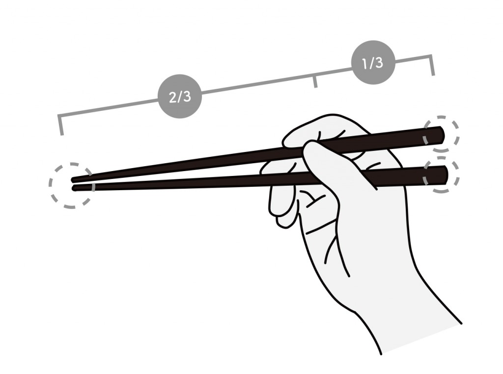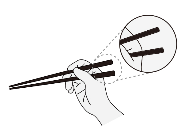 手に合ったサイズの箸であれば、箸頭から約1/3のところに親指をあて、鉛筆を持つように人差し指と中指の3本で持ちます。(持つ位置がわかるよう、シールやテープを巻くなどして親指の位置を教えます。)