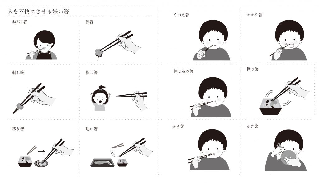 お料理や一緒に食事をする人に対して心を寄せ、周りの人に不愉快な思いをさせない心遣いが、周囲への優しさであり、食のマナーの基本です。それとは逆に、他の人に不快な印象を与えてしまう箸使いを「忌(い)み箸」または「嫌い箸」といい、無作法な行為とされてきました。