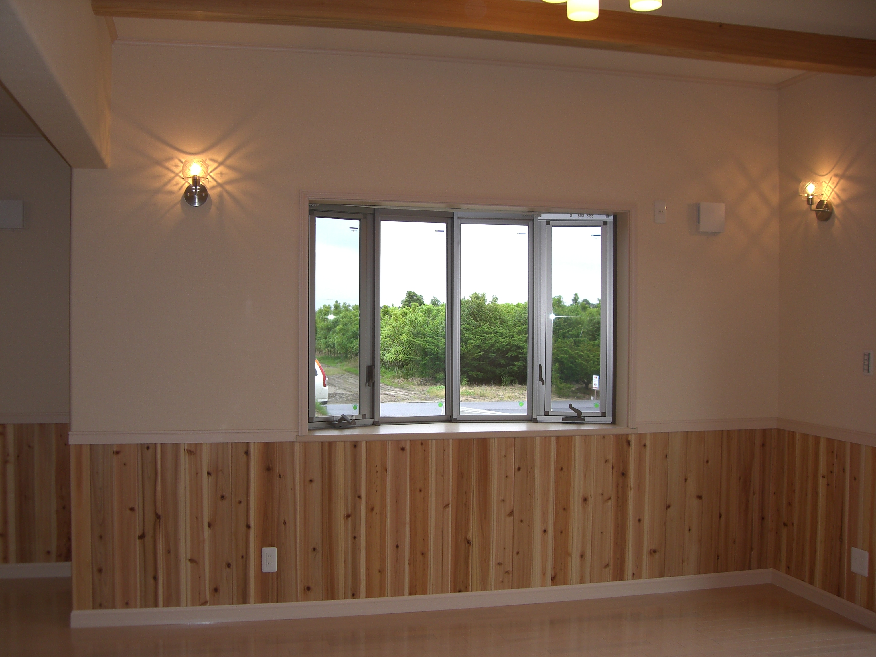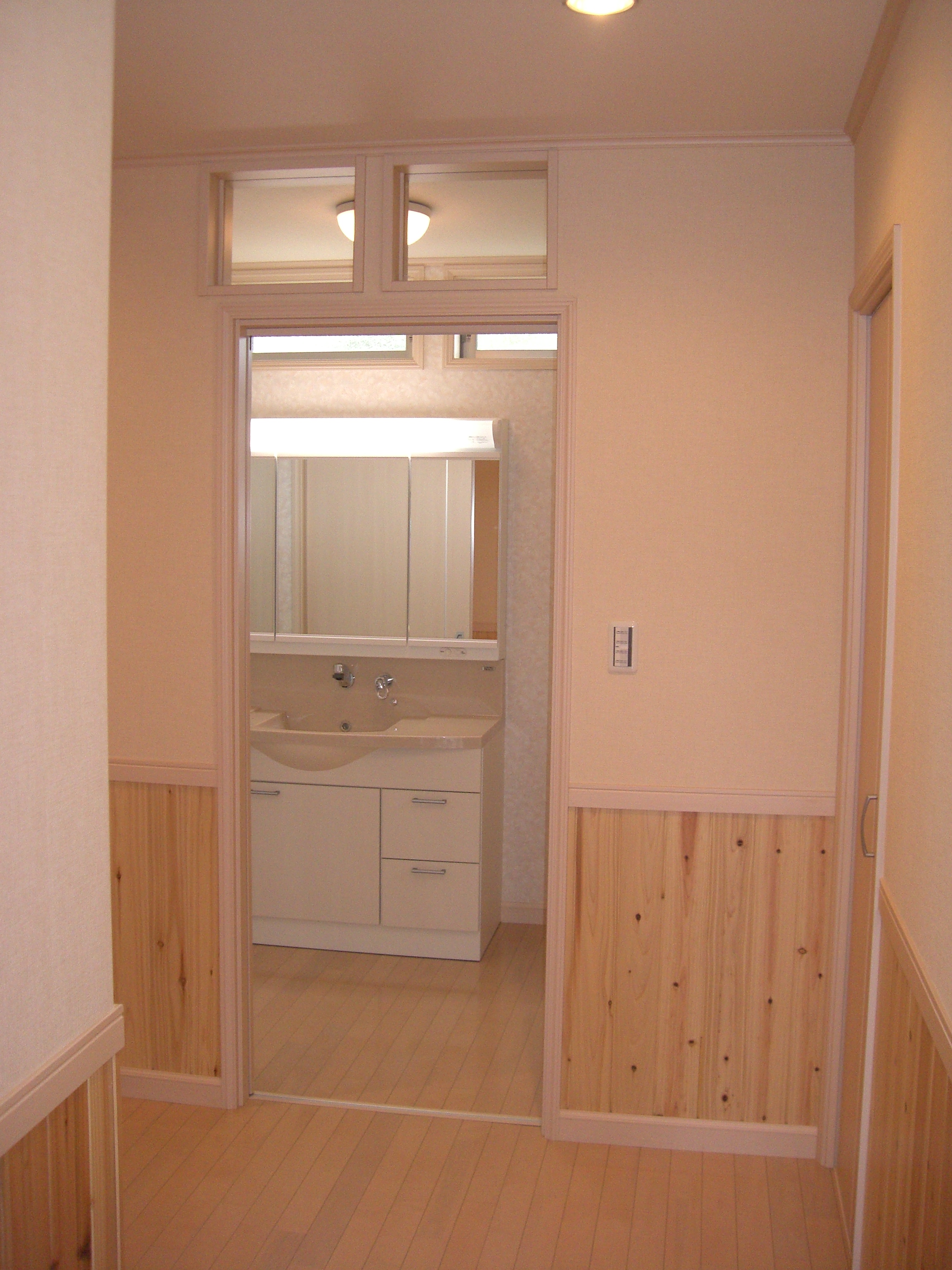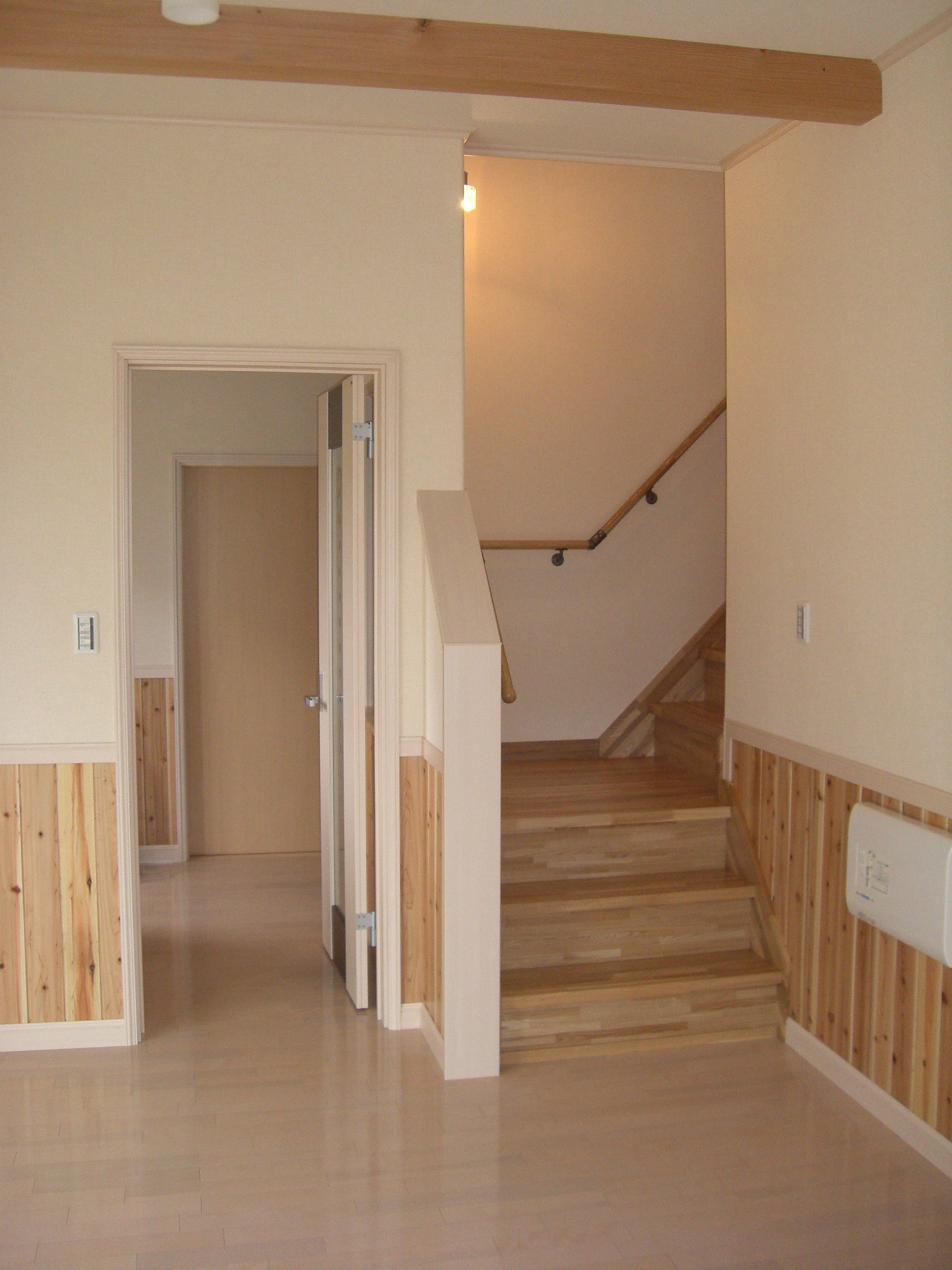 1階部分には、ナチュラル系のフローリングとドア、内装色を統一し、腰板として杉板を貼ることであたたかみのあるやさしいお部屋に仕上がりました。お子様が育つ環境として自然の素材にふれることで、ゆとりが生まれ知育の発達に良い影響を与えてくれます。そして自然素材は、お子様の成長とともに表情が変化して行くので、あきることがありません。