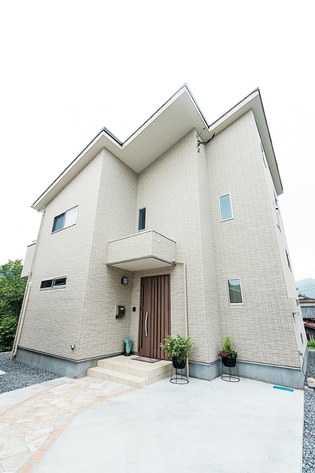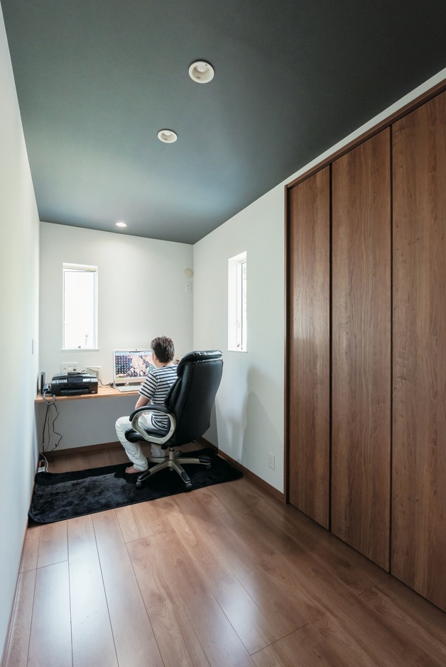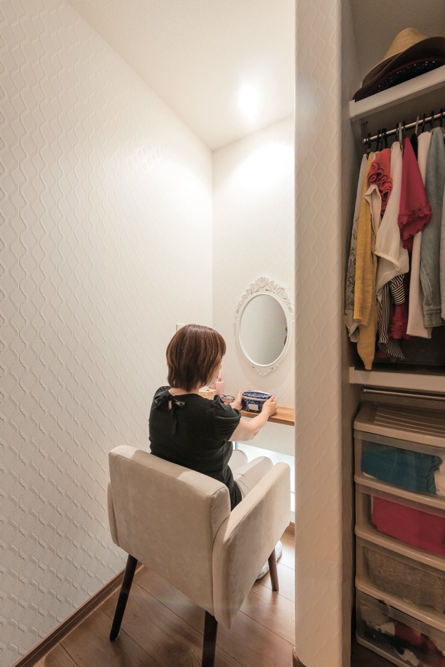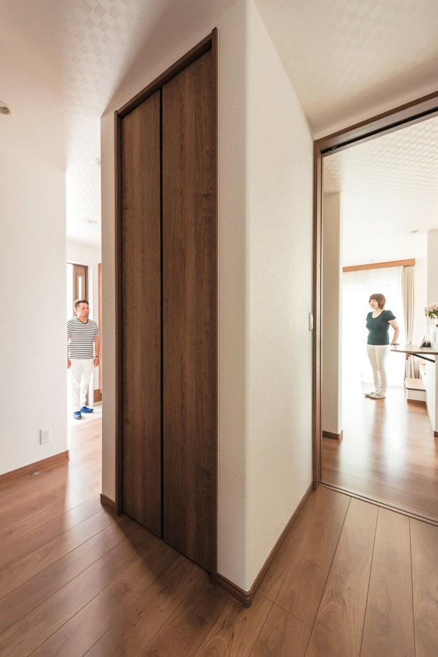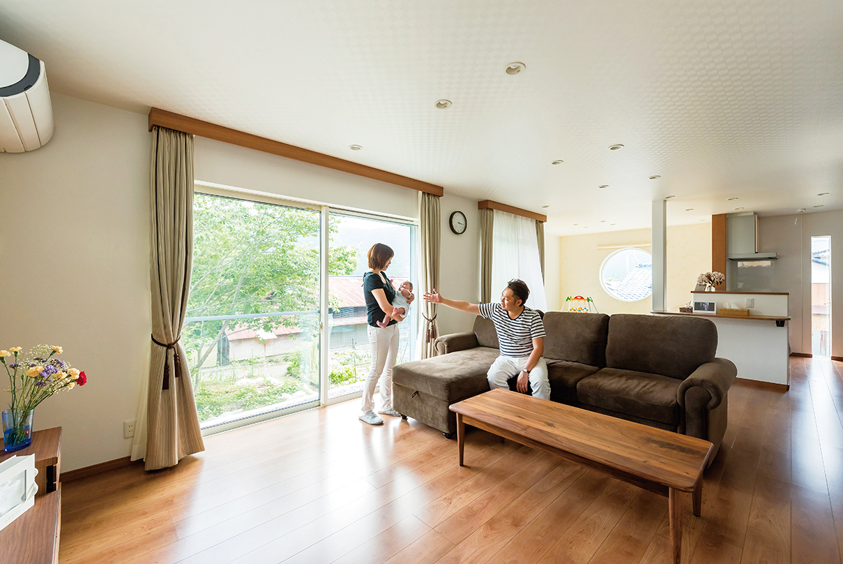 大きな掃き出し窓や畳コーナーの丸窓が視線に抜け感を作り、ハイタイプの建具で縦空間の広がりを強調しているLDK。「ちょっと驚きの空間にしたかったんです」と語るご主人の言葉通り、実際の広さもさることながら、来客が思わず「わぁ!」と声を上げる開放感が生まれました。明るめのフローリングと白基調の壁と天井にしたことも効果があり、その上で、風水に基づいて、西には黄色やゴールド、北にピンクなど、各部屋に運気の上がる色が入った壁紙がセンス良くチョイスされています。奥さまが独身時代に風水インテリアを試したところご主人と出会ったということもあり、新居にも家族の幸せを願って取り入れられました。産休明けには仕事に復帰する予定の奥さま。子育てや家事に便利な動線も、良く考えられています。もともと当社の断熱材を気に入っていただき始まった家づくり。ひと冬越して暖かさも実感でき、機能面、住み心地ともに大満足の家になりました。