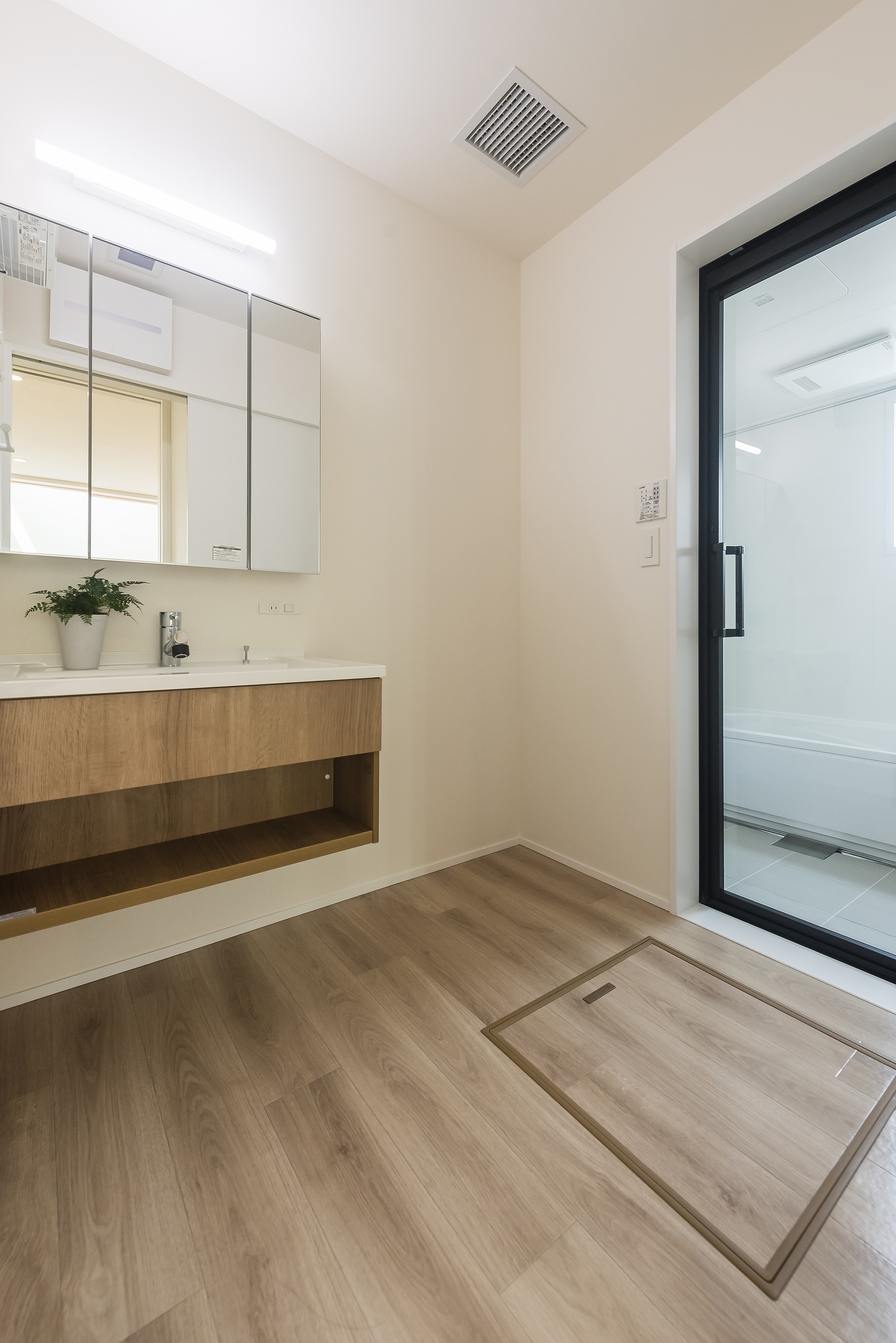 エアコン1台、全館空調システムで空調した暖気・冷気を家中に届け、24時間365日お風呂場やトイレまで家中の室温を20℃にキープ。大きな吹き抜けのあるリビングでも温度ムラを感じることなく快適に過ごせます。