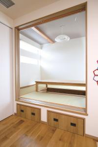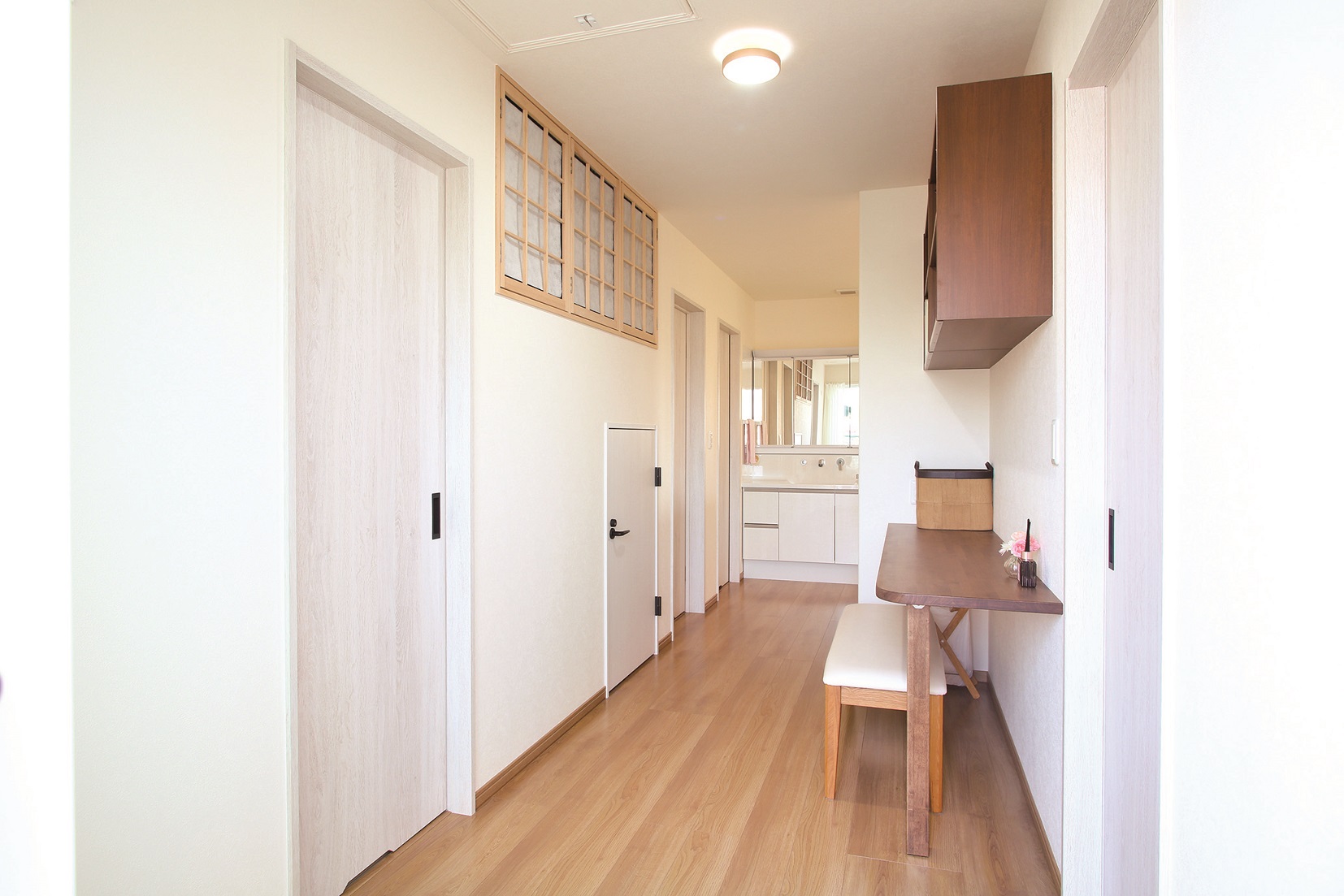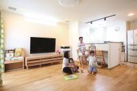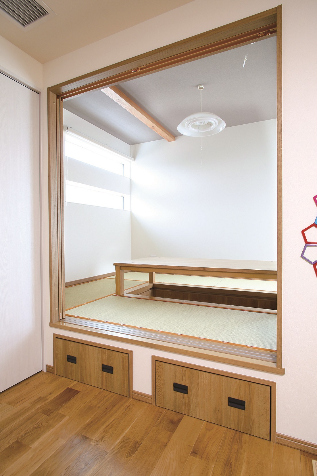 1階は、キッチンからリビング、和室、浴室、デッキまで見渡すことができ、リビングに隣接した小上がり&掘りごたつ式の和室は、お客様をもてなす自慢の空間になりました。朝の混雑を解消するため、2階には洗面台と洗濯機を設置!家事ラク動線を実現しました。子育て中心の間取りになり過ぎないよう、ご夫婦それぞれの趣味部屋も確保し、自分だけの時間を楽しめるようになっています。