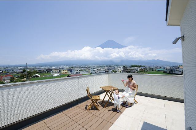 緑と花に囲まれ、子育ての環境に恵まれた贅沢なロケーションの富士緑道沿いにたたずむお家。三角形の敷地を活かし、建物の南北西側にピッチング練習ができるほどの広い庭を確保しました。そして、「富士山を眺めながら暮らしたい!」という奥様のリクエストにお応えし、1階、2階、屋上庭園のどこからでも富士山が見えるよう建物を配置しました。屋上庭園からは、勇壮な富士山を眺めながらBBQやプールを楽しんだりと、アウトドアリビングとして大活躍してくれます。