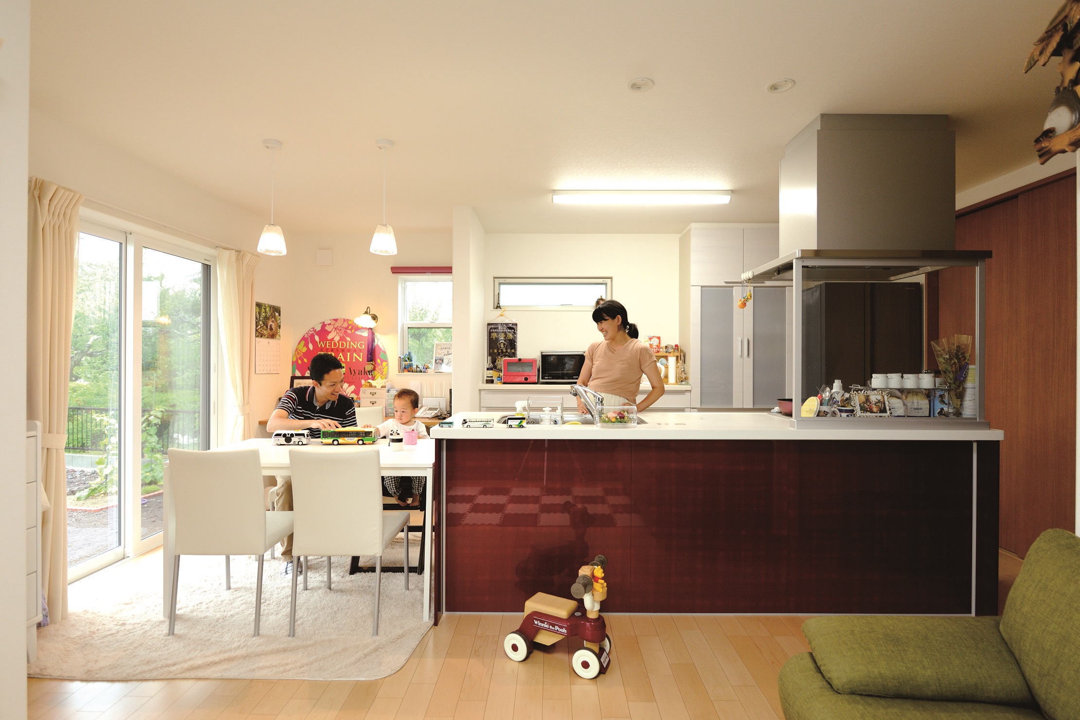 広い庭から光と風がたっぷりふりそそぐ家族団らんの心地いい空間となりました。