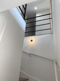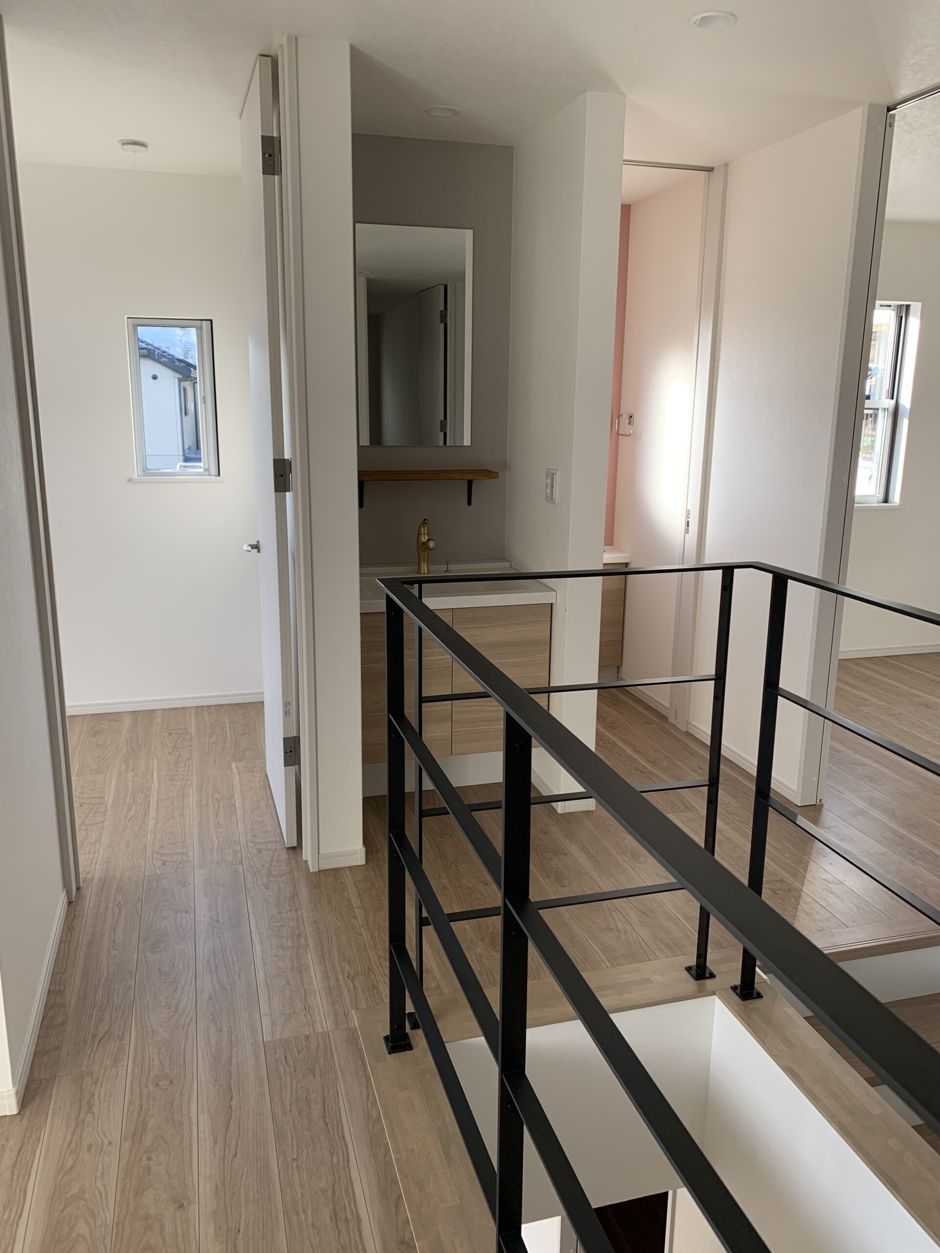 柱や梁の木目を見せた意匠に、アイアン手摺の吹き抜けが開放感を演出します。