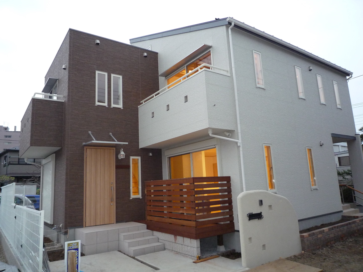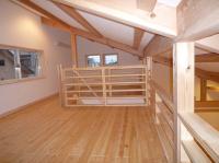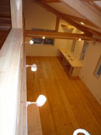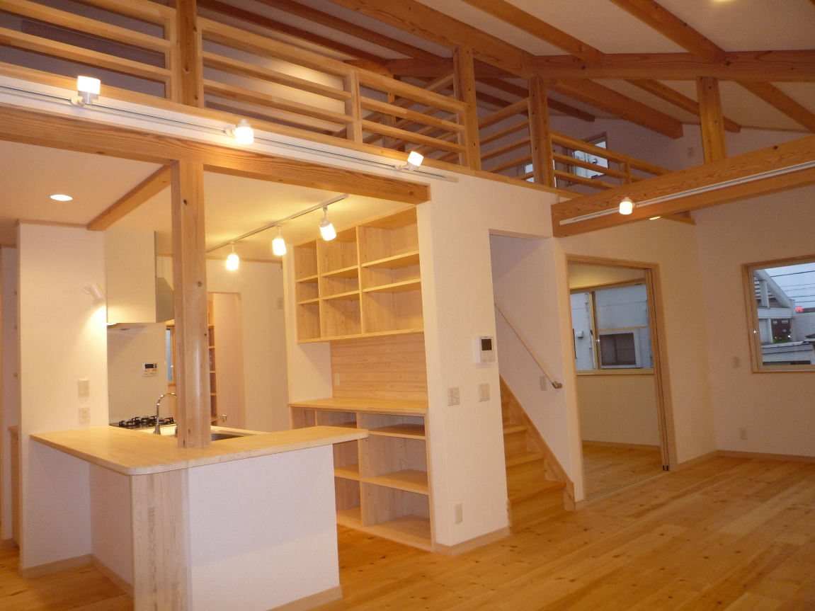 二つの玄関は別々ですが、屋内に入ると仕切りの少ない自由につながる二世帯住宅になっています。2階のLDKは勾配天井+ロフトで広々大空間になりました。ロフトへは固定階段で上がります。子供達が大喜びで走り回る大きなロフトができました。キッチン周りは収納が豊富です。大工さんが頑張って造作してくれました。