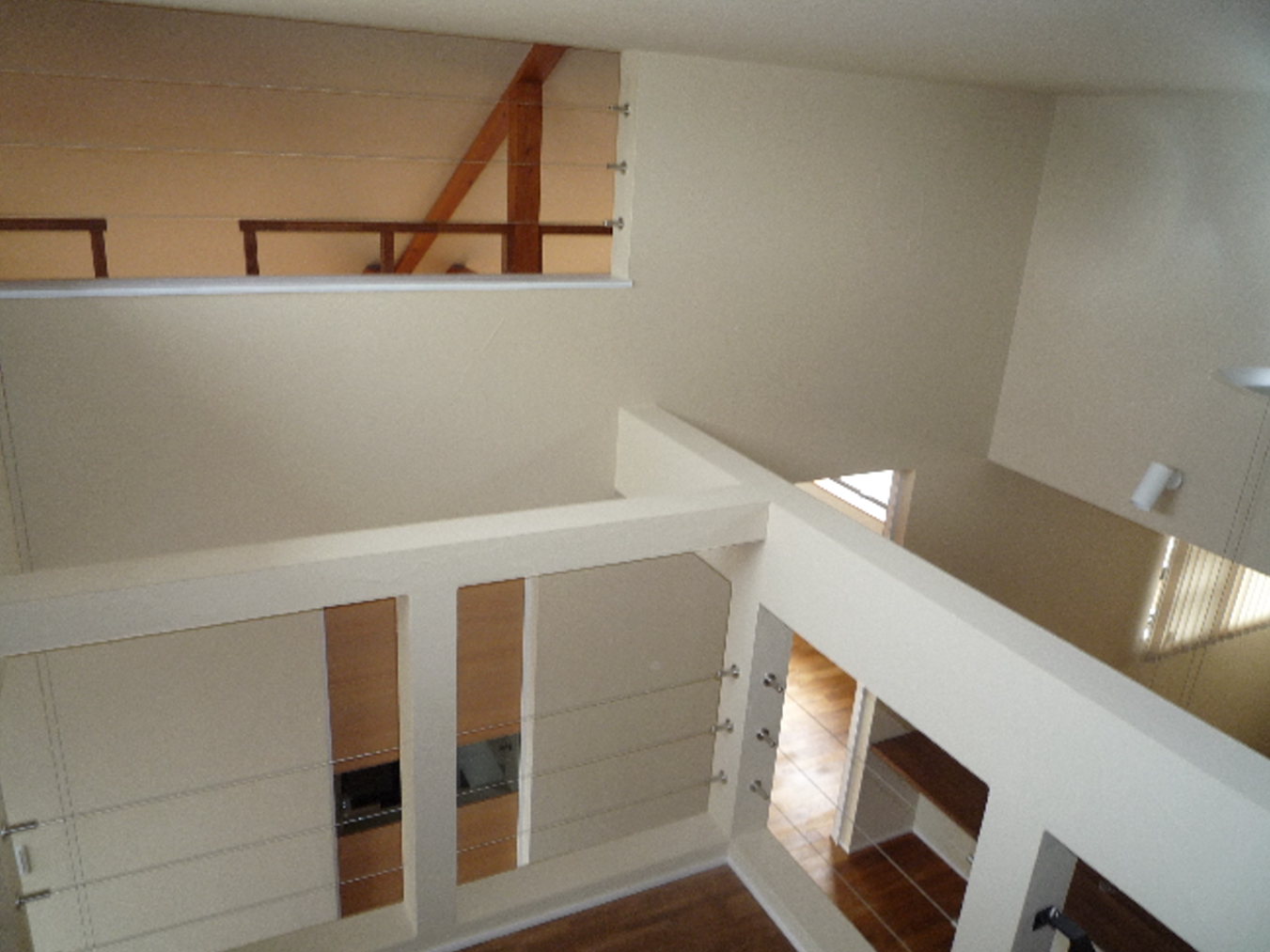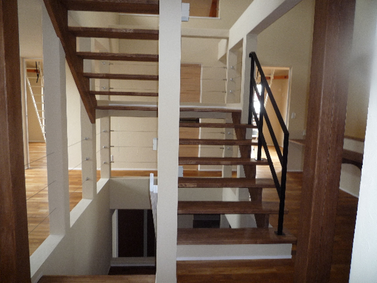 ガルバ鋼板・ぬり壁・板貼りを組み合せ、設計顧問の先生とじっくり造り上げた「力作」が完成しました!ステンレス仕上げのオーダーキッチンです。広々としていて、たいへん使いやすく、大勢集まってもOKです。1階からロフトまで繋がる階段を回廊する、開放的な廊下です。