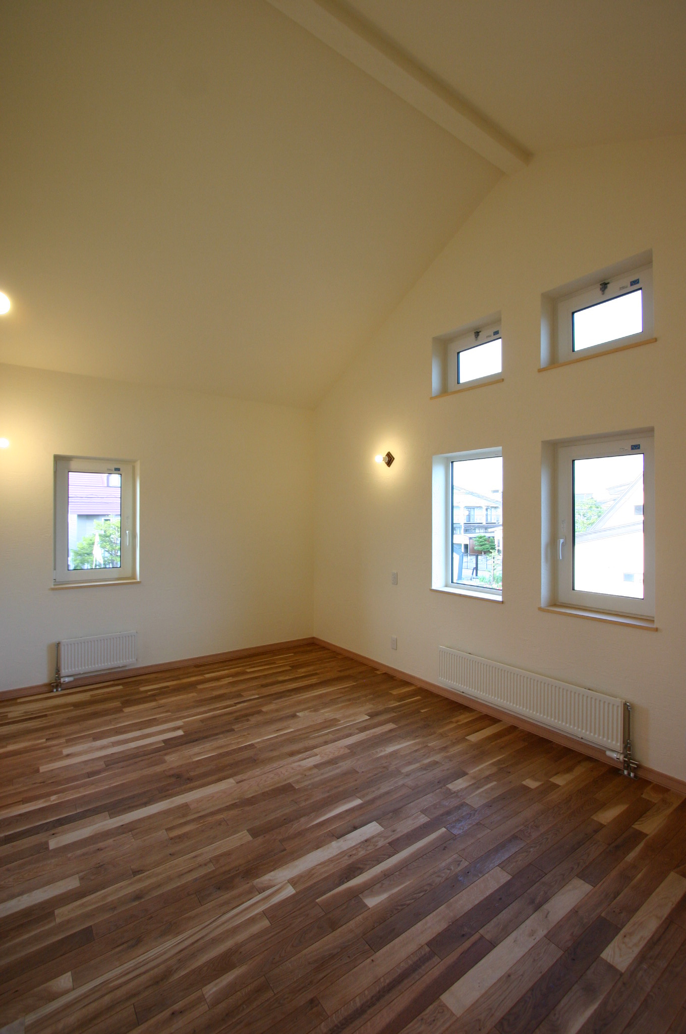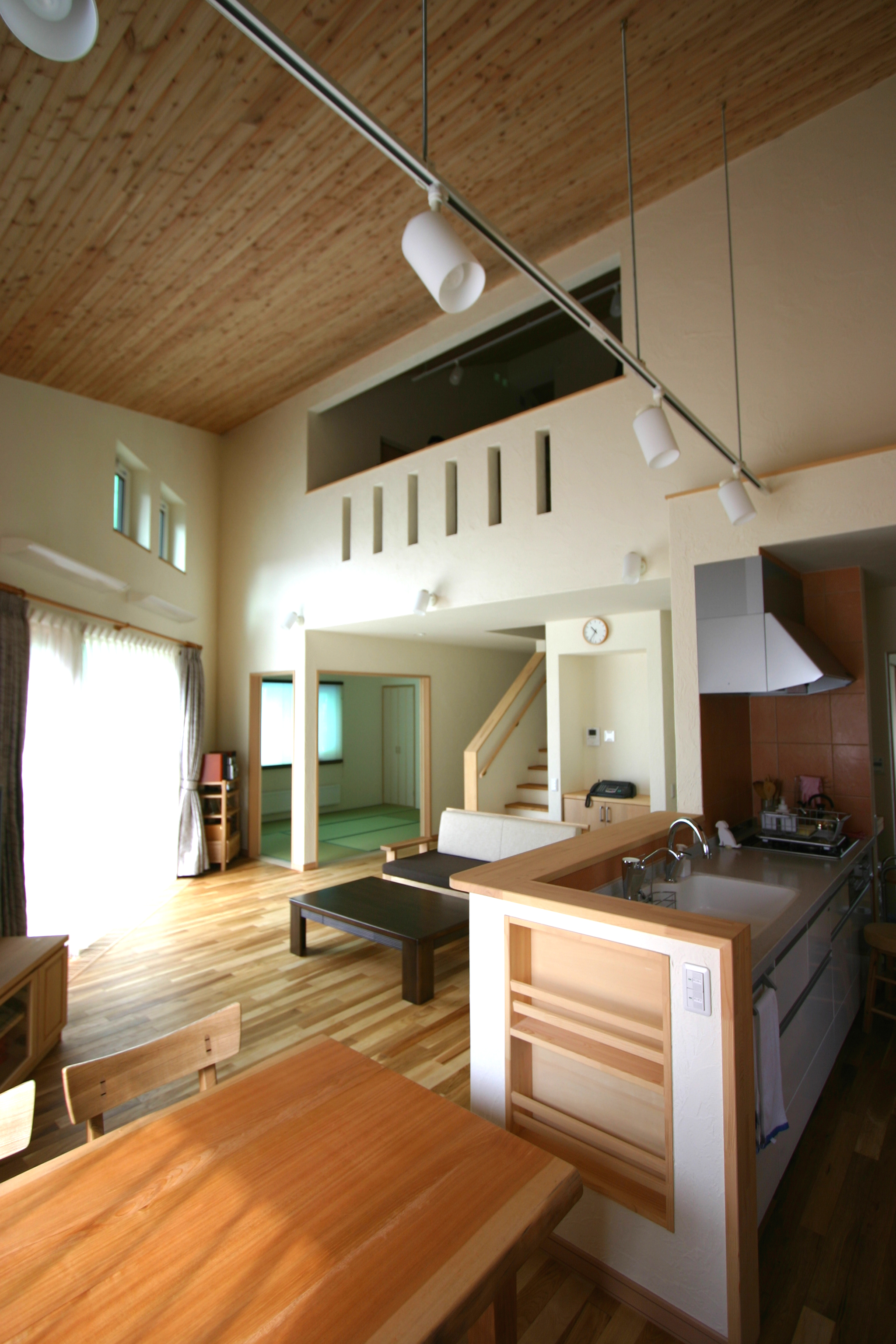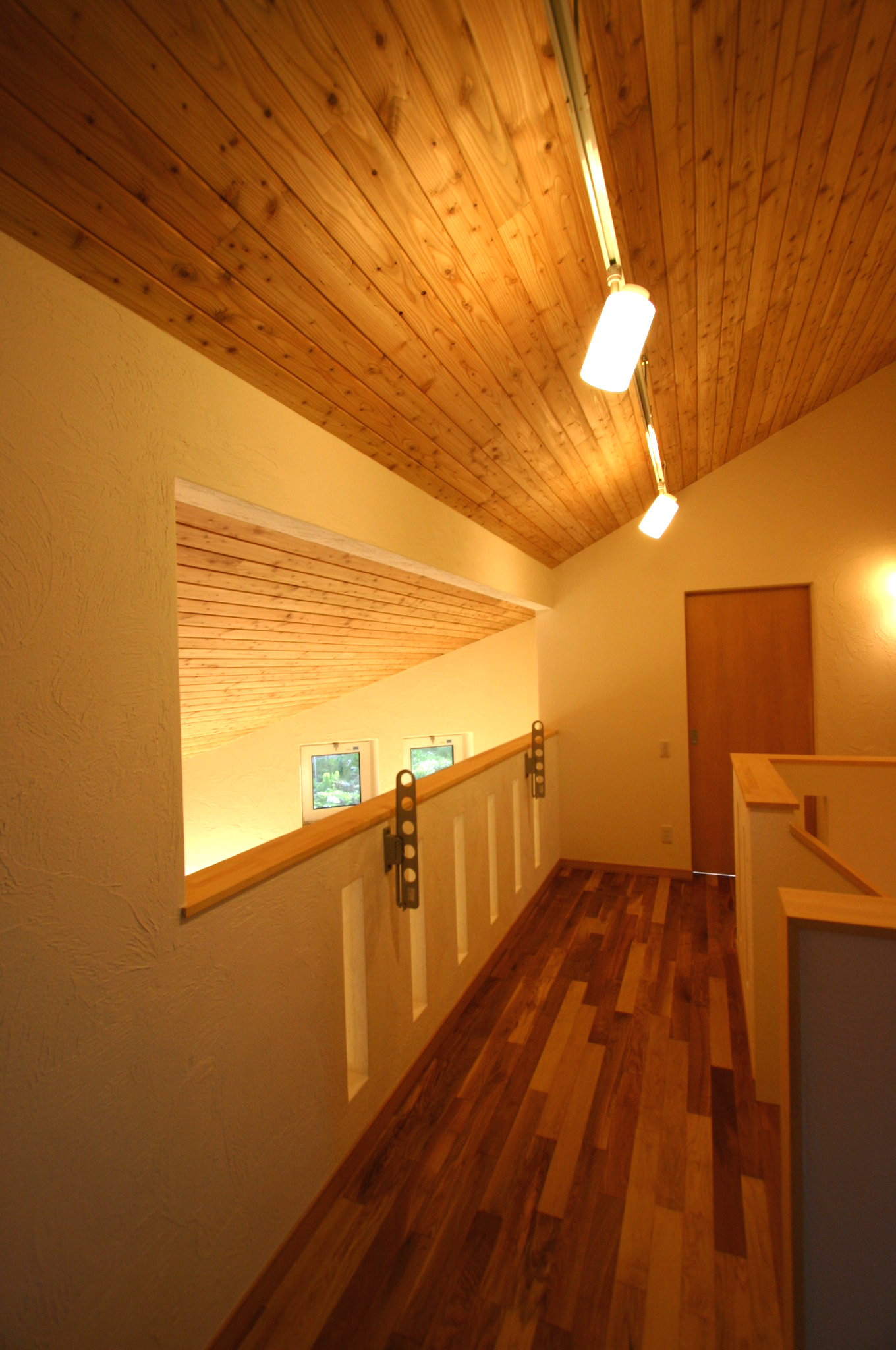 木目が美しいカラマツ羽目板の天井が2階ホールへと繋がり、開放感を高めます。