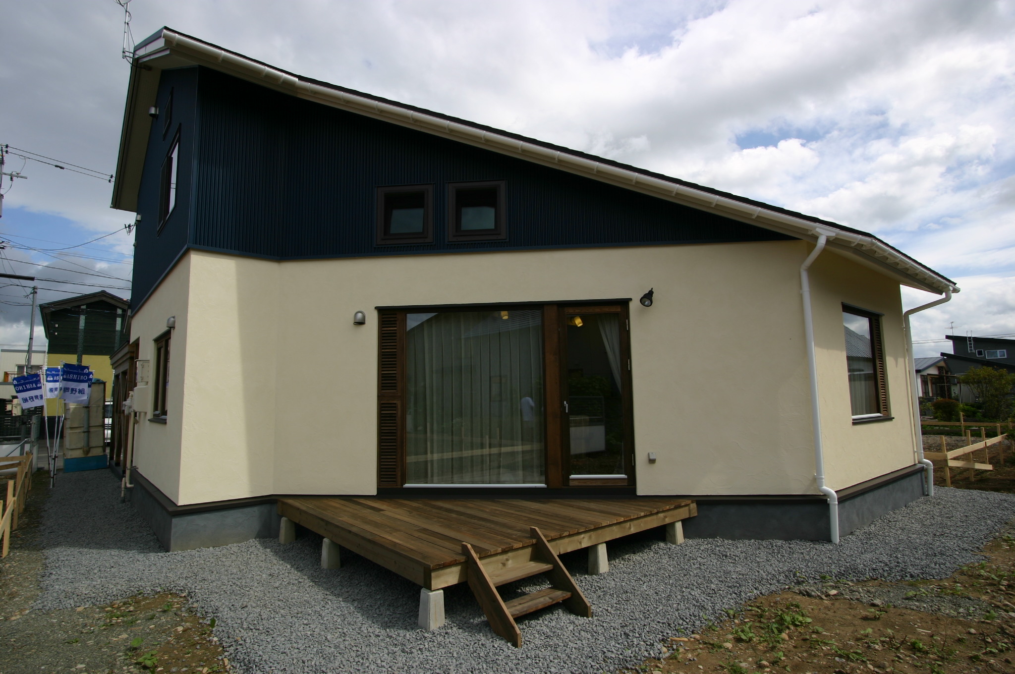 1階外壁はテラコート塗り・木製サッシを使用、2階外壁はガルバリューム鋼板・樹脂サッシを使用しました。