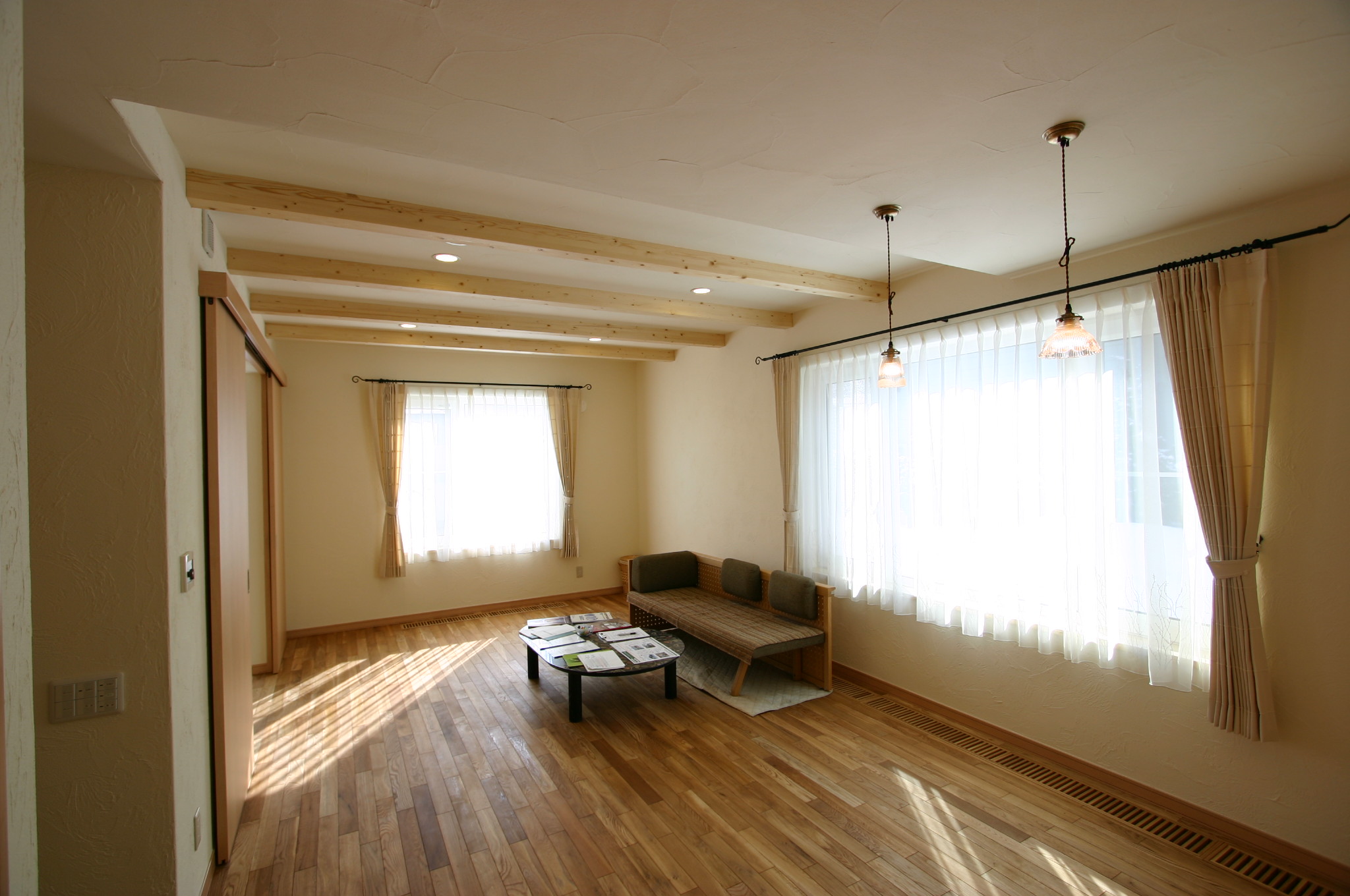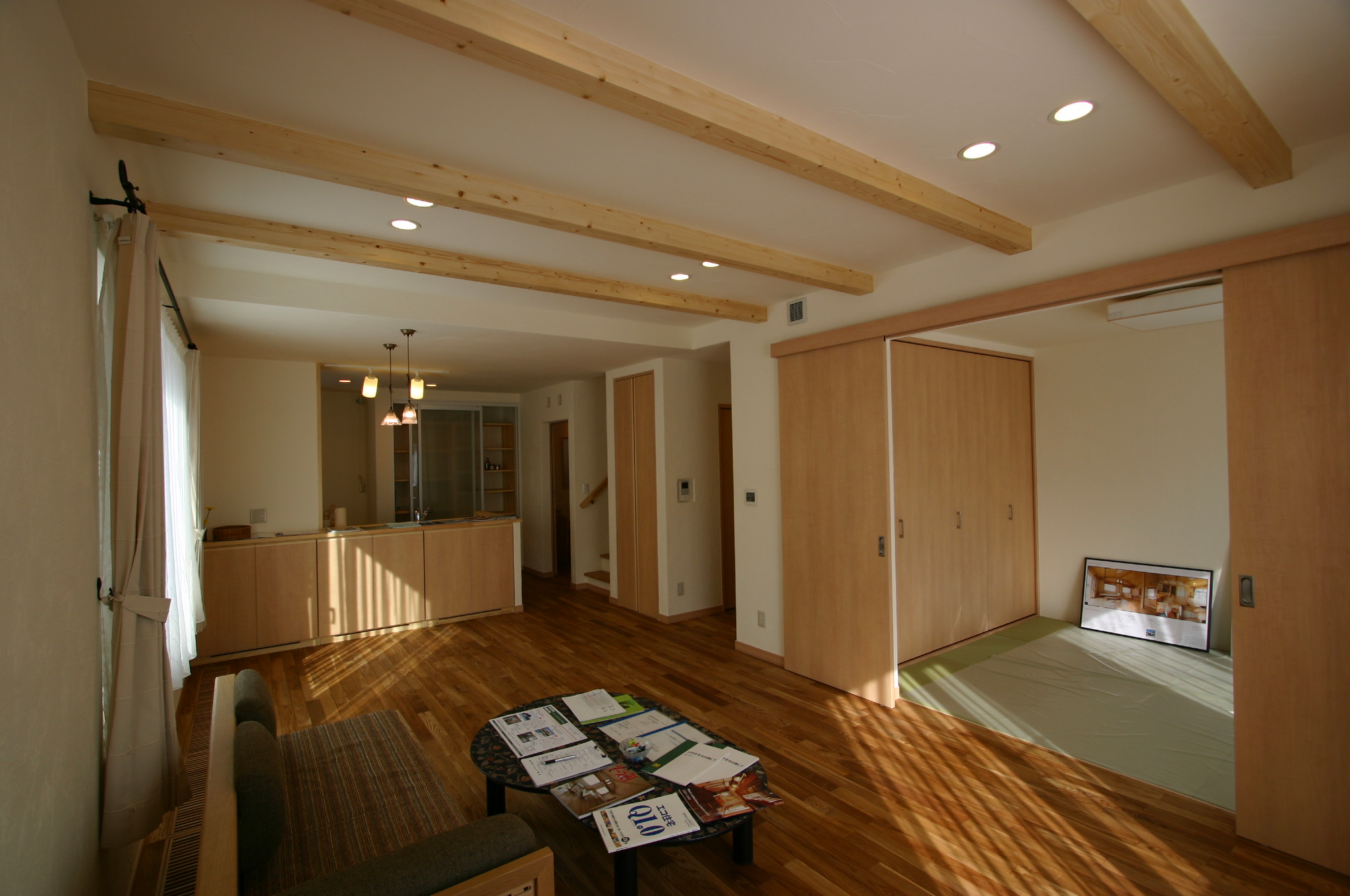 珪藻土で塗られた白い壁・天井の室内は明るく、リビングの天井に見える梁がアクセントになっています。