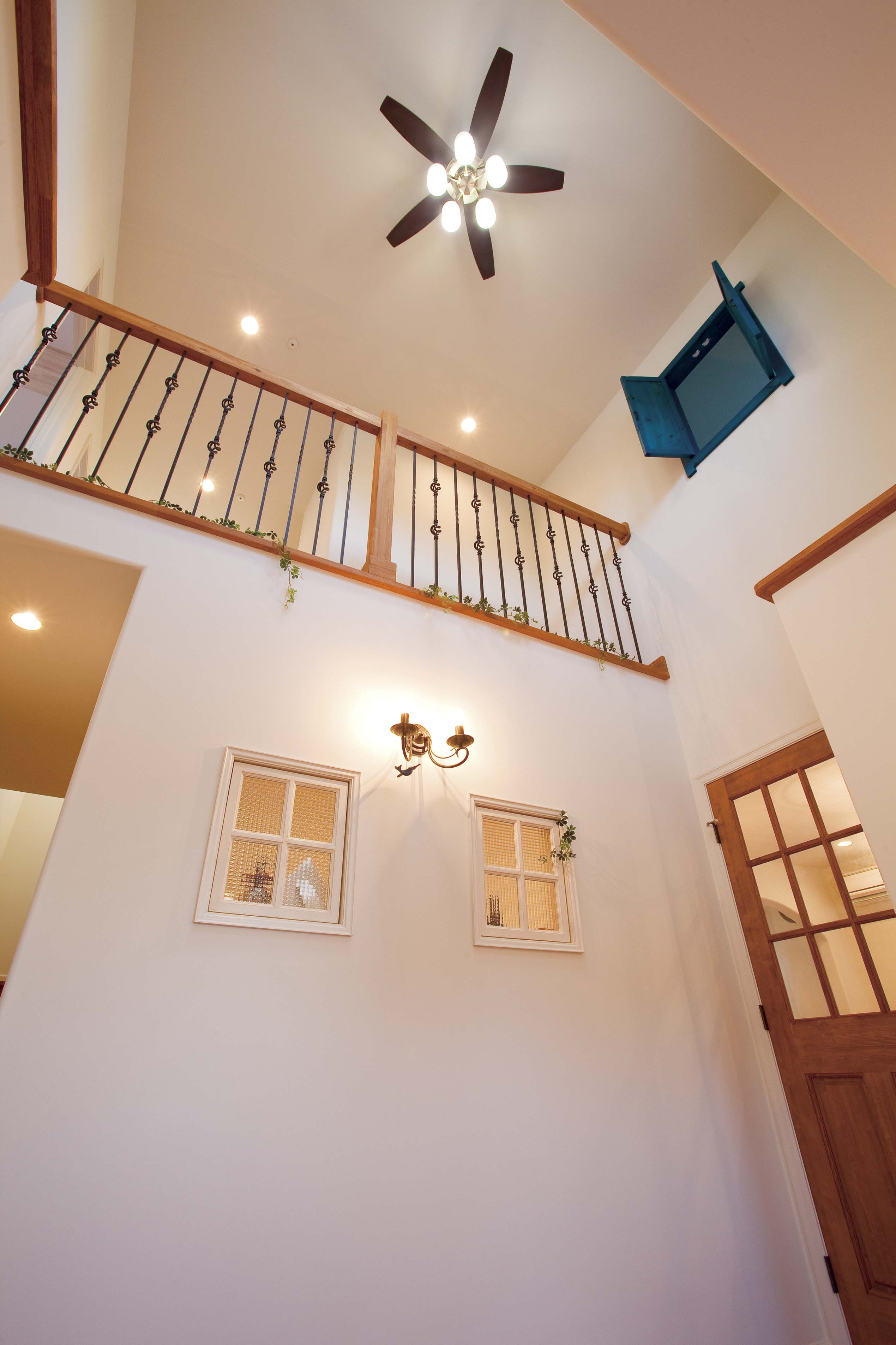 開放感のある吹き抜けを設置した玄関は可愛いらしいランプやアイアンの手摺が印象的。