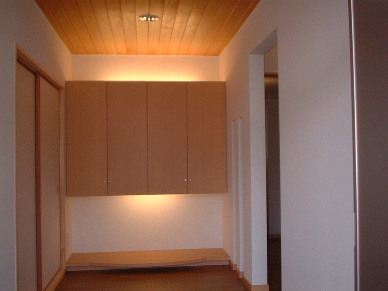 シンプルに仕上げた和室や、玄関を入って正面に見える棚の上下には、間接照明で和の雰囲気を作りました。