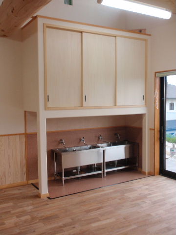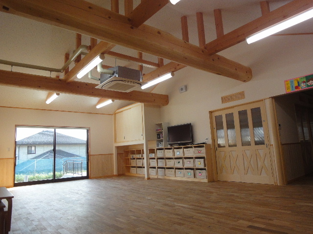 傾斜天井にダイナミックな丸梁のある保育室。床はナラ無垢フローリング。ナラは堅木なので、傷のつきやすい床に適した材料。子供たちの手がふれる腰壁には杉の羽目板を。